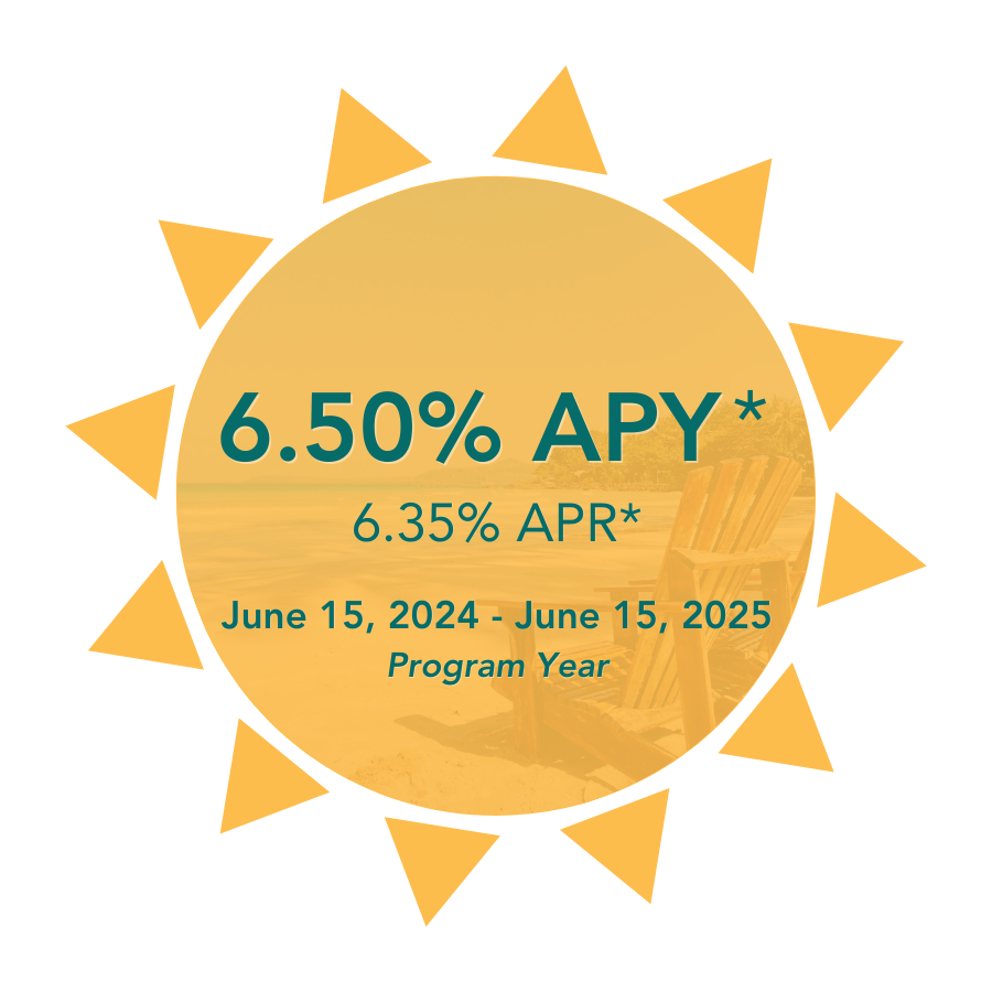 *APY: Annual Percentage Yield, APR: Annual Percentage Rate. Advertised rate begins at the start of the 2024-2025 program year on June 15, 2024. In the event the account is closed or funds are withdrawn before maturity, dividends that have not been credited are forfeited. APY assumes dividends remain in account until maturity; early withdrawals reduce earnings. Dividends begin to accrue once funds are deposited into account. Dividends paid at the end of each calendar quarter and at account maturity on June 15, 2025. Balance computation method is as described in our Truth in Savings Agreement. Monthly direct deposit or payroll deduction of $50 – $2,000 must be set up for account; money transfer apps (i.e.: Zelle, Venmo) do not count as direct deposit. After 60 days of no deposits, Summer Savings Club account will be closed, and funds will be transferred to your regular savings account. Account will not be closed if there are no deposits during the summer months, but will be closed if deposits do not start by October 1, 2024. Earnings transferred to chosen savings account at account maturity. Account automatically renews at maturity with the updated rate for the new program year. Limit 1 Summer Savings Club account per member. Federally insured by the NCUA.